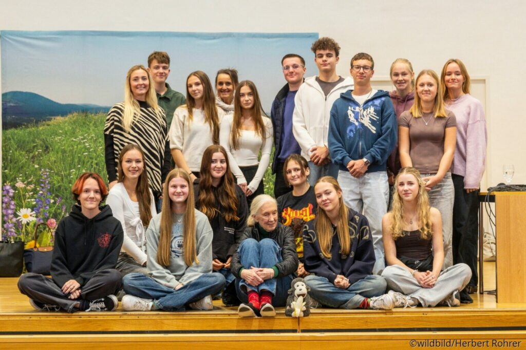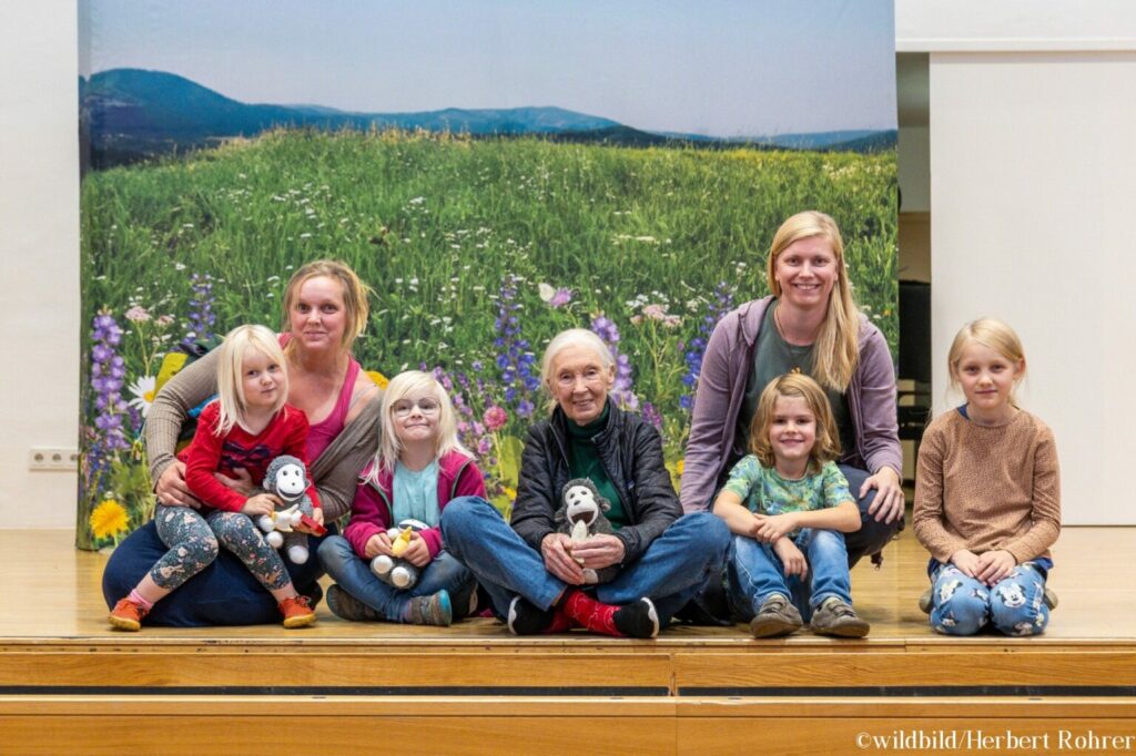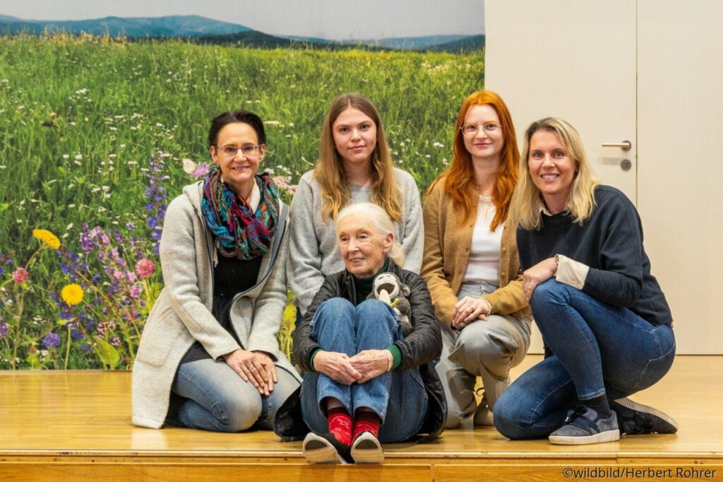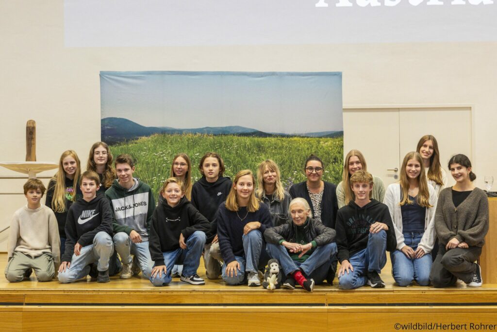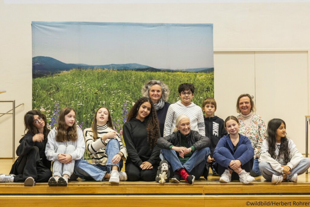Zum Abschluss hatten die Klassen noch die Möglichkeit ein Erinnerungsfoto mit der 90jährigen Jane Goodall zu machen.