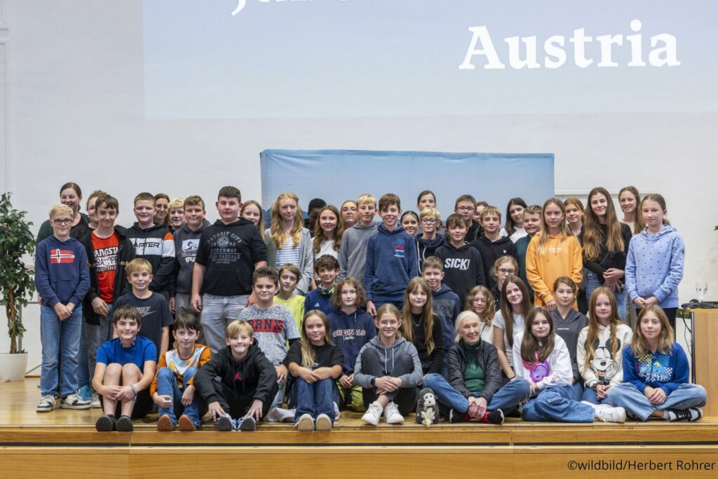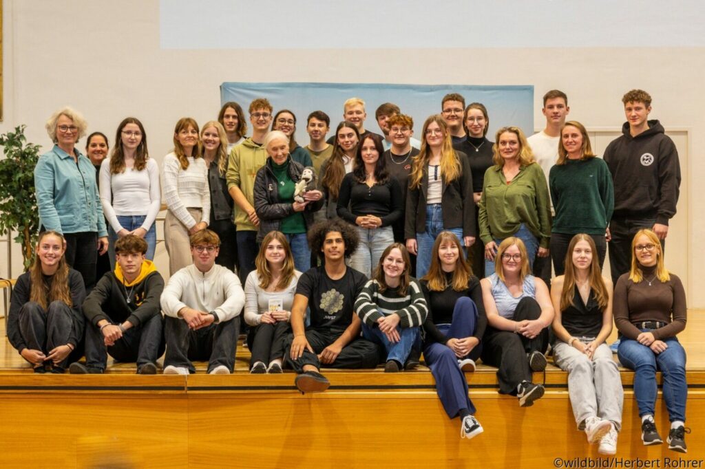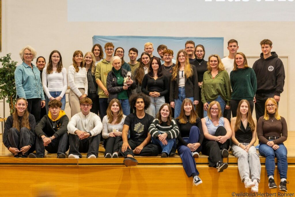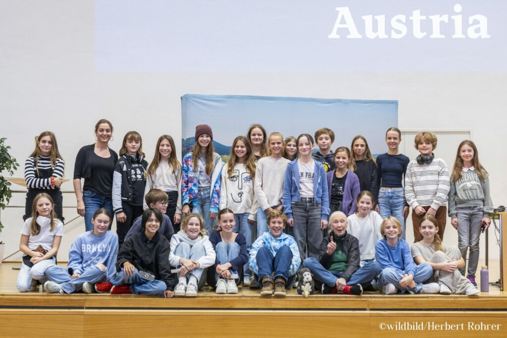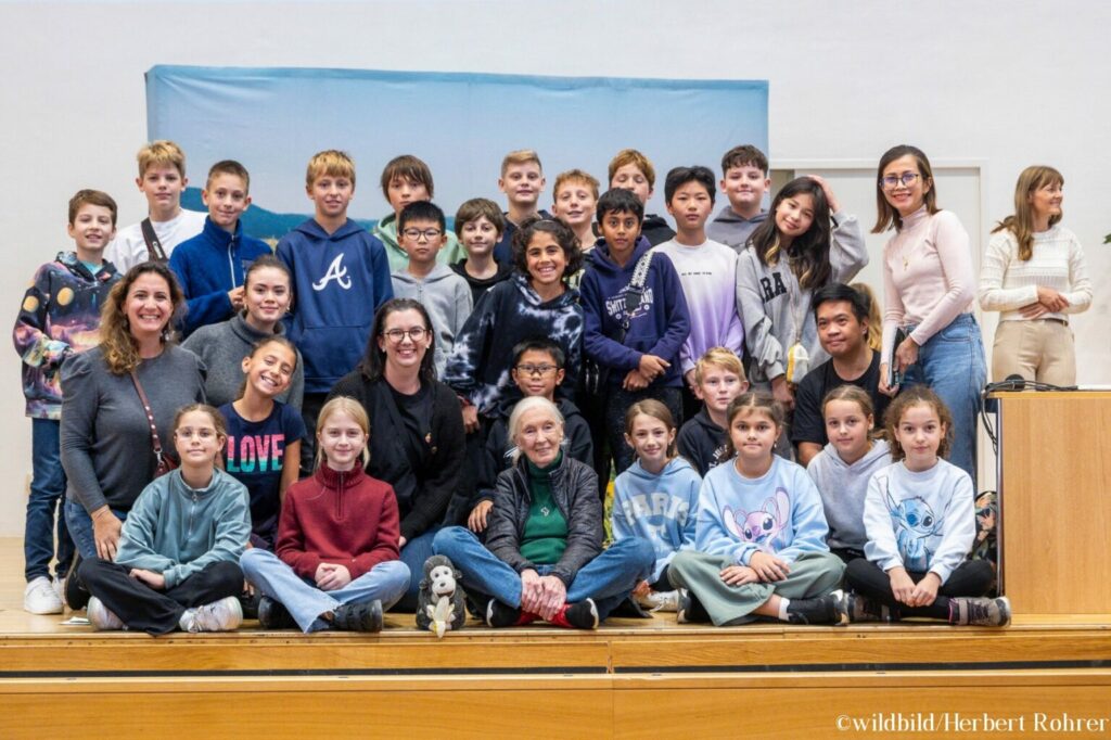 Zum Abschluss hatten die Klassen noch die Möglichkeit ein Erinnerungsfoto mit der 90jährigen Jane Goodall zu machen.