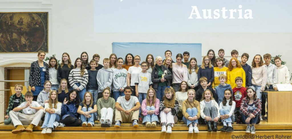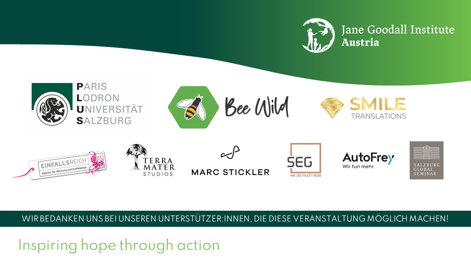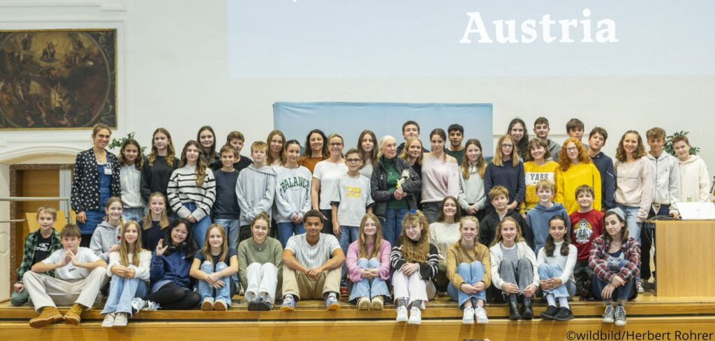 Da hat es gewuselt in der großen Universitätsaula der Universität Salzburg. Über 600 Kinder, Jugendliche und Studierende versammelten sich, um eine der größten Wissenschaftlerinnen und Aktivistinnen unserer Zeit live zu erleben. Bevor Jane Goodall jedoch über ihre Gründe der Hoffnung sprach und aus ihrem bewegten Leben erzählte – präsentierten Österreichische Roots & Shoots-Gruppen am „Markt der Möglichkeiten“ ihre Projekte.