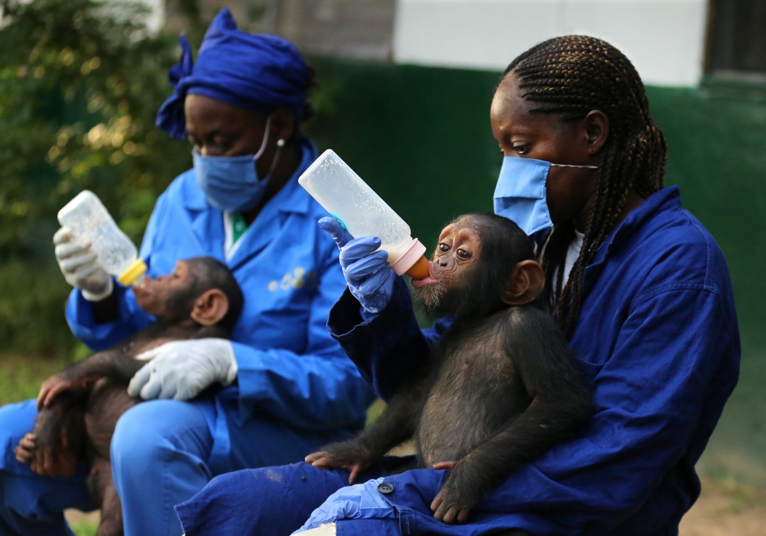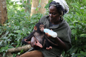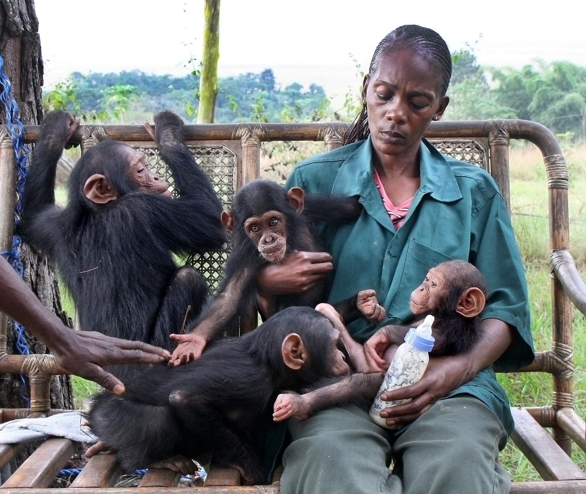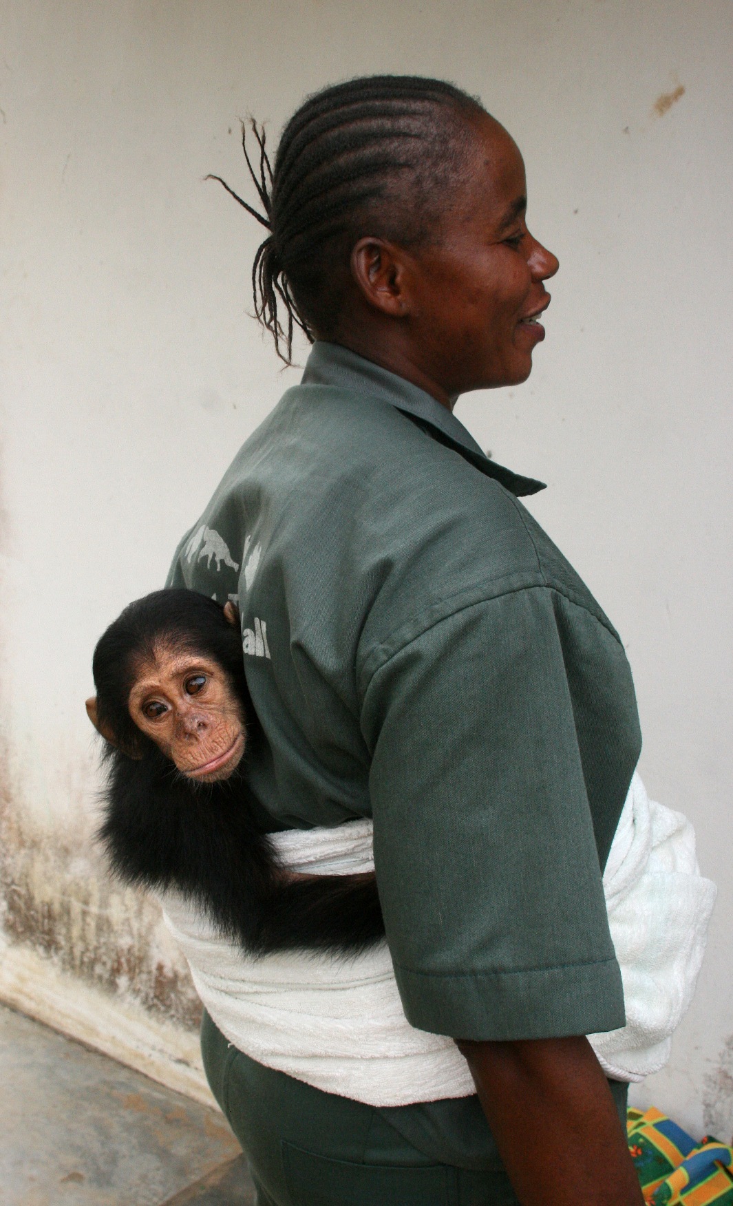 Gerade in den letzten drei Jahren konnte das Team von Tchimpounga mehrere junge Schimpansen retten. Wenn ein verwaistes Schimpansenbaby in der Station ankommt, befindet es sich oft in einem schrecklichen körperlichen und emotionalen Zustand. Schimpansen haben, wie Menschenkinder, eine lange Entwicklungszeit und sind oft bis zum Alter von 8 Jahren oder älter auf ihre Mütter angewiesen. Wenn sie als Babys ihren Müttern entrissen werden, ist es der liebevollen, intensiven Zuwendung der Betreuer des Schutzzentrums zu verdanken, dass sie sich Schritt für Schritt erholen. Betreuerinnen wie Antonette fungieren als Ersatzmutter. Unermüdlich und 24 Stunden lang schenken sie ihren Pfleglingen ihre ganze Zuneigung. Ihr Ziel ist es, dass sich das Babys geschützt, sicher und geliebt fühlt, da diese frühe Phase entscheidend für seine psychologische Entwicklung ist.