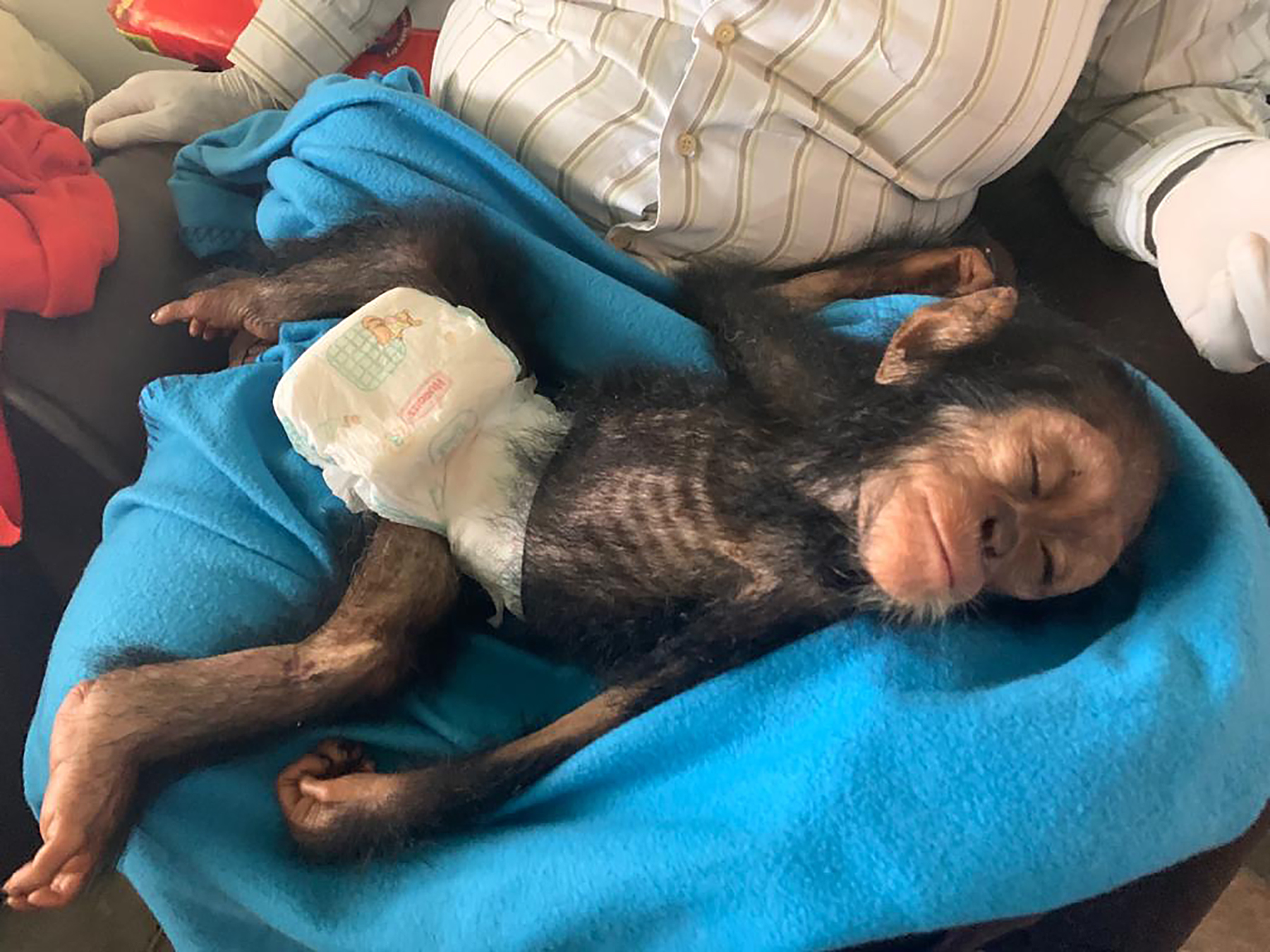 Infant Perrine arrives at Tchimpounga after rescue.