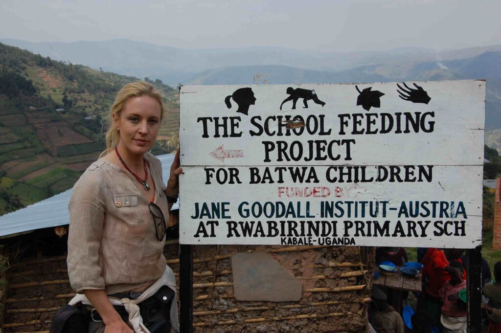 Als wir mit einer Gruppe des Jane Goodall Institute Austria in Uganda waren und Janes Projekte dort besucht haben und zu den Batwa Pygmäen reisten, für die ich Patin sein darf, wurde dort mit Hilfe des Jane Goodall Instituts eine Schule gebaut. Eine Riesenerrungenschaft! Ein Wassertank und eine warme Mahlzeit anbieten können, um Kindern, und vor allem Mädchen, einen Ausweg, eine Zukunft zu geben. Etwas für das ganze viele Menschen weltweit kämpfen, finden wir „doof“?