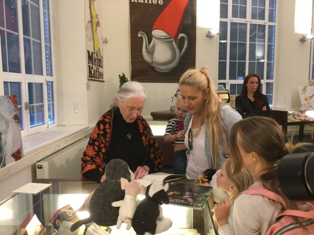 Jane saß ,wie meine Kinder, schon als kleines Mädchen in England in den Wipfeln der Bäume. Und hat davon geträumt eines Tages nach Afrika zu reisen. Sie hat alles wahr gemacht und noch mehr. Sie war damals keine Studierte. Sie war ein Mensch mit ungeheurer Empathie und einem großen Traum. Sie hat ihn wahr gemacht und wurde eine der größten Forscherinnen und ein wahrer Rockstar unter den Aktivistinnen. Die sanfteste Aktivistin die ich kenne. Sie hat begriffen, dass man diese Art von Träumen, von unbändiger Kraft, von Vision fördern muss. Janes Mutter hat das getan. Ich denke auch deswegen hat Jane später ROOTS & SHOTS gegründet. Um das allen Kindern zu ermöglichen. Um etwas für ihr Recht auf ihre Zukunft zu tun. Um ihre Zukunft selbst zu gestalten.